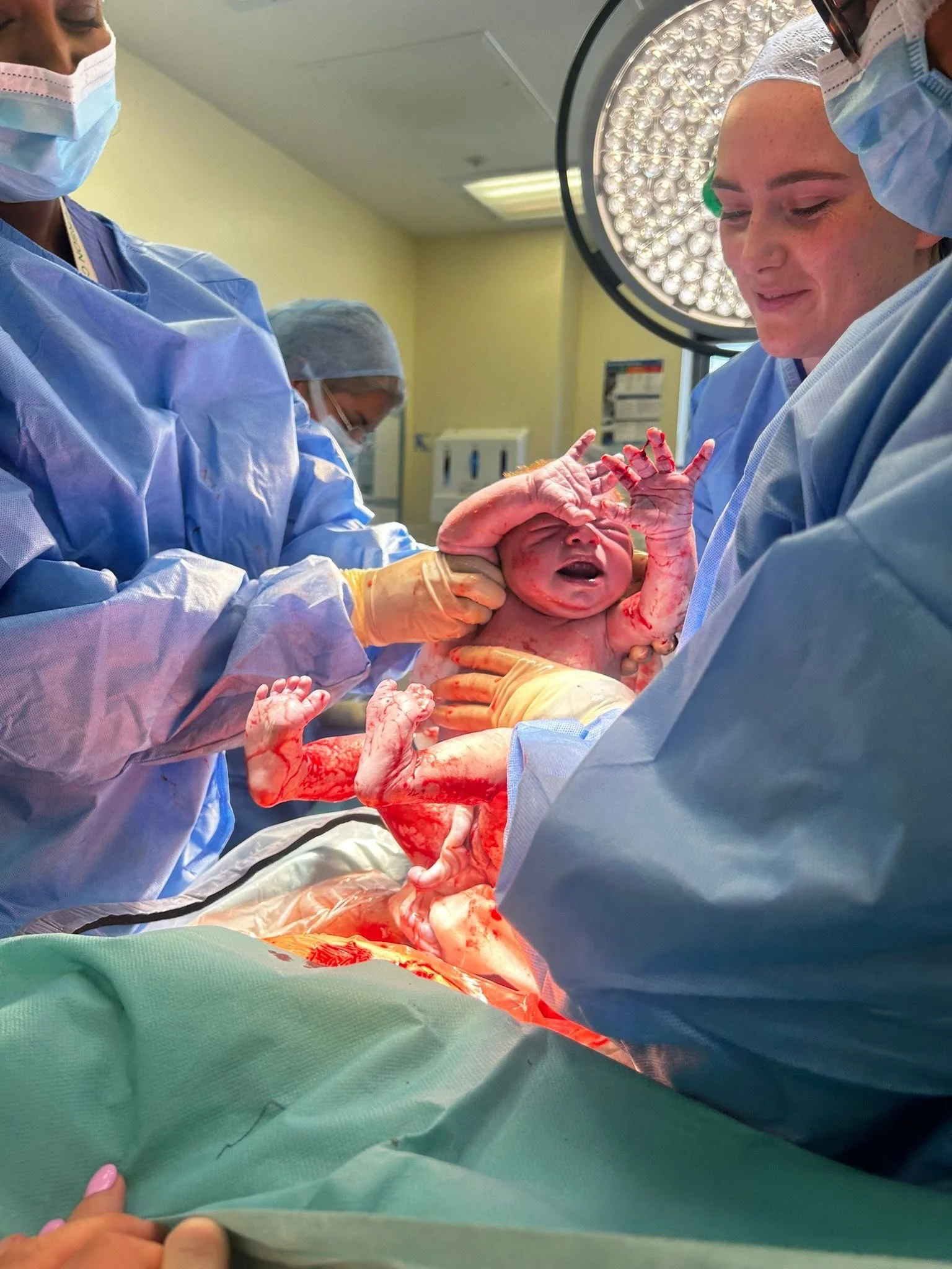 I got to watch my baby being birthed through my belly (the surgeons pulled the curtain down when she was still half in me so I could watch) and although she had to be quickly taken away for a minute to get her breathing regulated, this gave me and my partner a moment to embrace and cry together. I soon had her placed on my chest for skin to skin, and not long after, she started to breastfeed. In that moment, I knew what true love was.